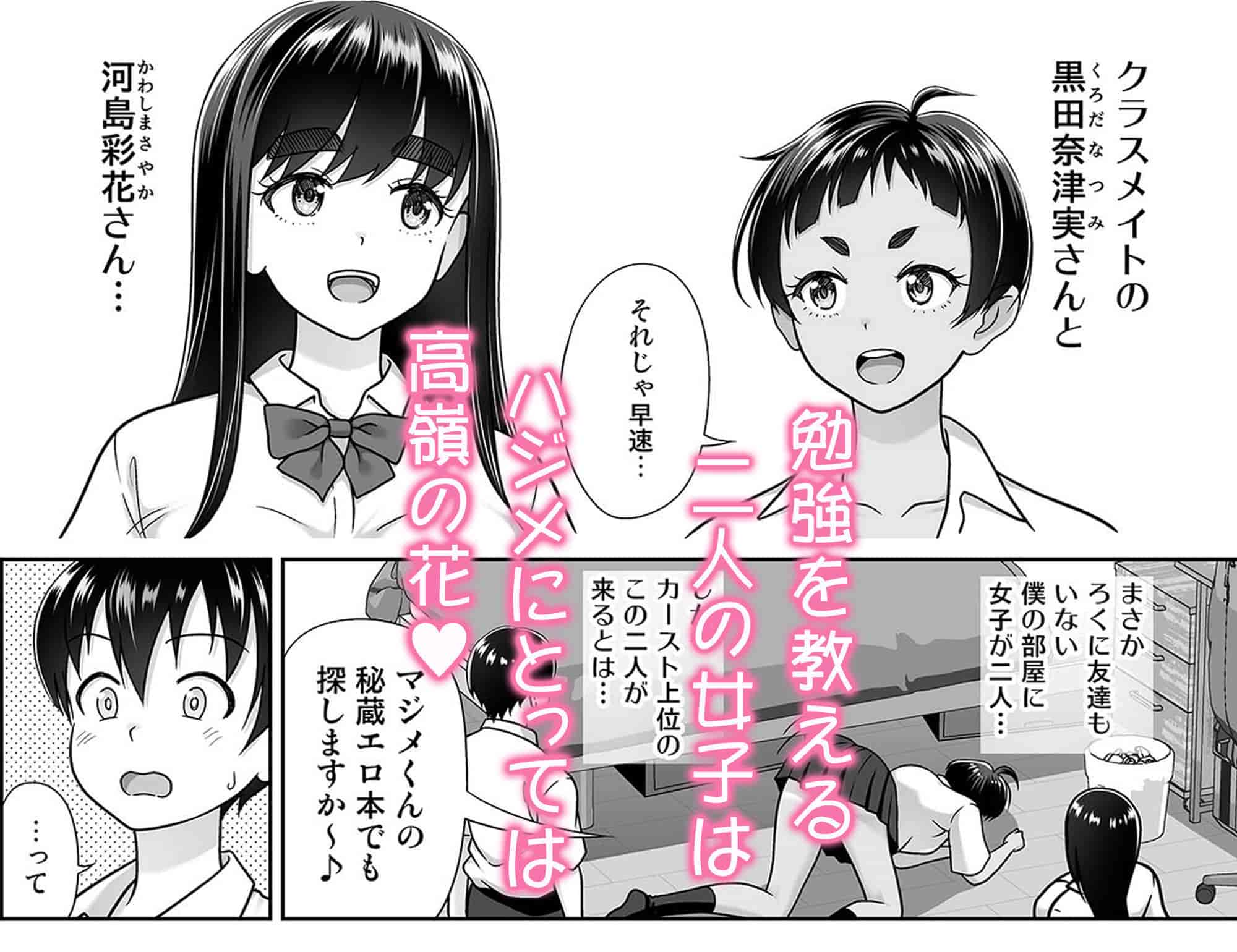 奈津実のクールビューティー感と、彩花の優しさ。この二人に囲まれてドギマギする主人公ハジメの視点がめちゃくちゃ共感できます。特に成績アップ後の打ち上げ→お礼のお勉強展開は、「そう来るか!」ってなる王道なのに新鮮な流れ。
